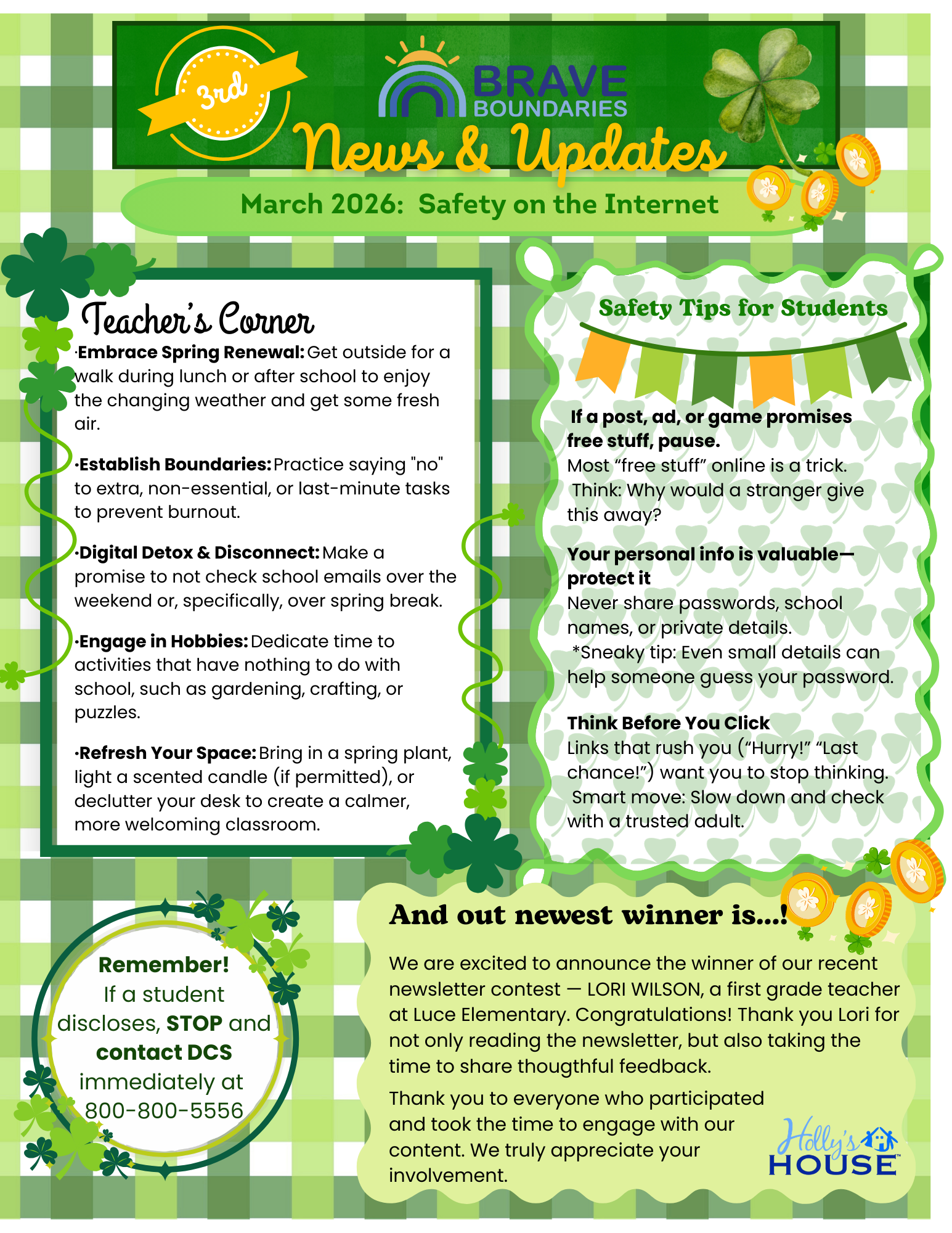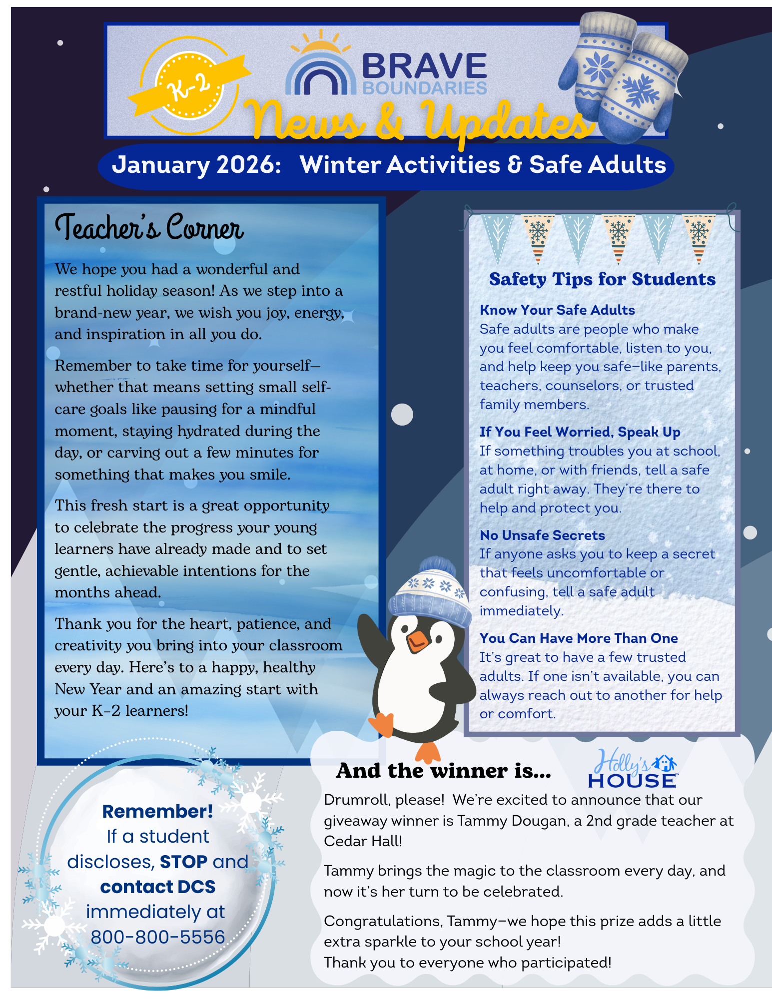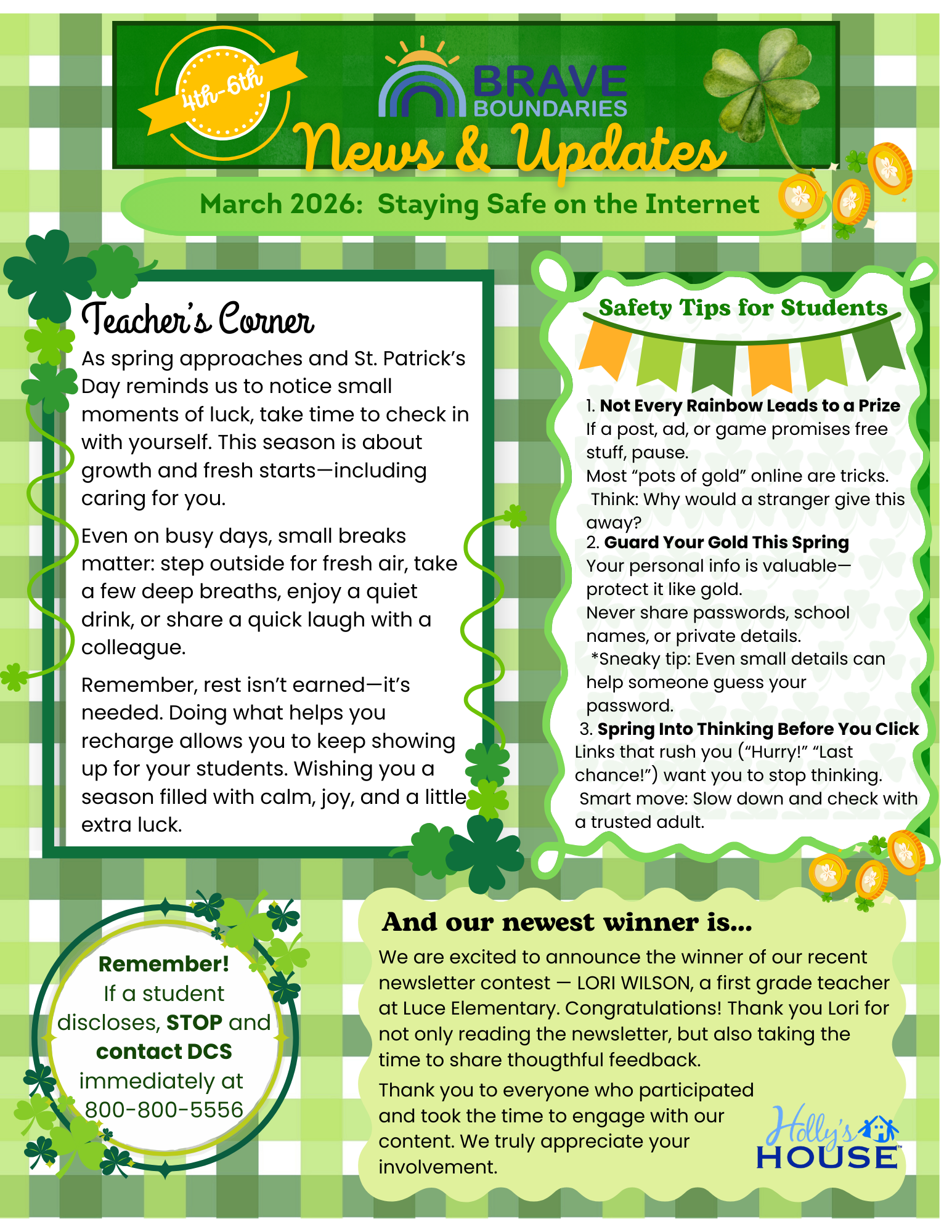 Brave Boundaries seeks to educate students on safety every day, not just once a year when we visit a student’s classroom. The Brave Boundaries newsletters allow us to reiterate the topics we cover in the classroom to students year-round. The newsletters are divided into 3 grade levels: K-2nd grades, 3rd grade, and 4th-6th grades. The newsletters are available for teachers to use in their classrooms for SEL lessons or for parents to use with their children at home. The newsletters provide safety tips, stories about Lawson the Parrot, and safety games to review material.