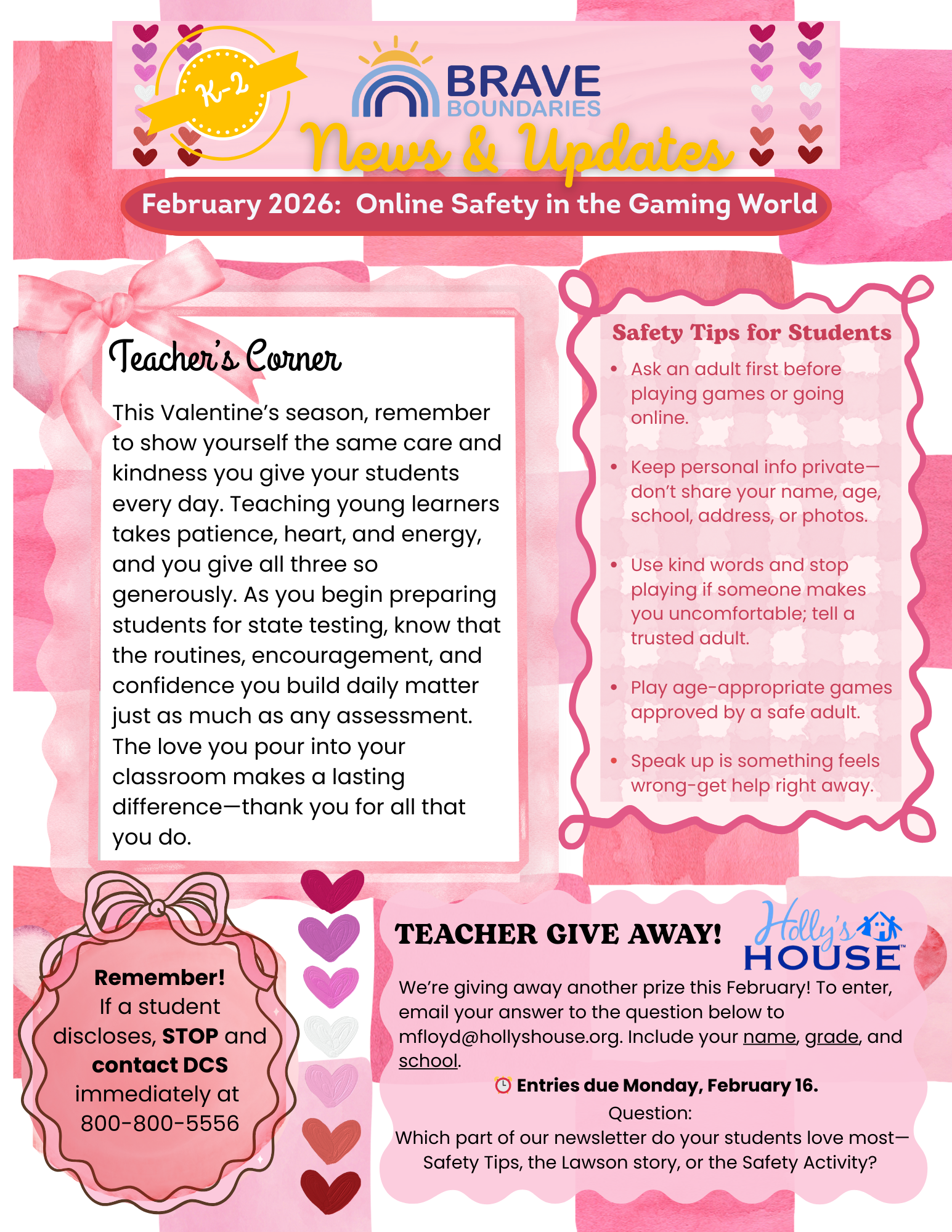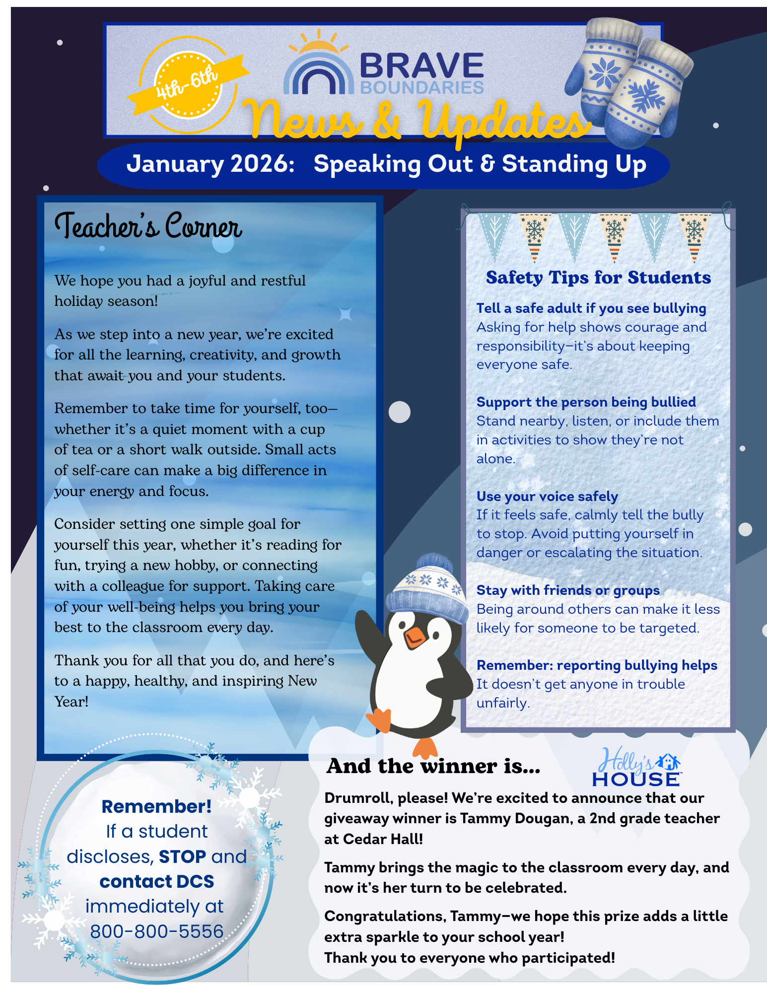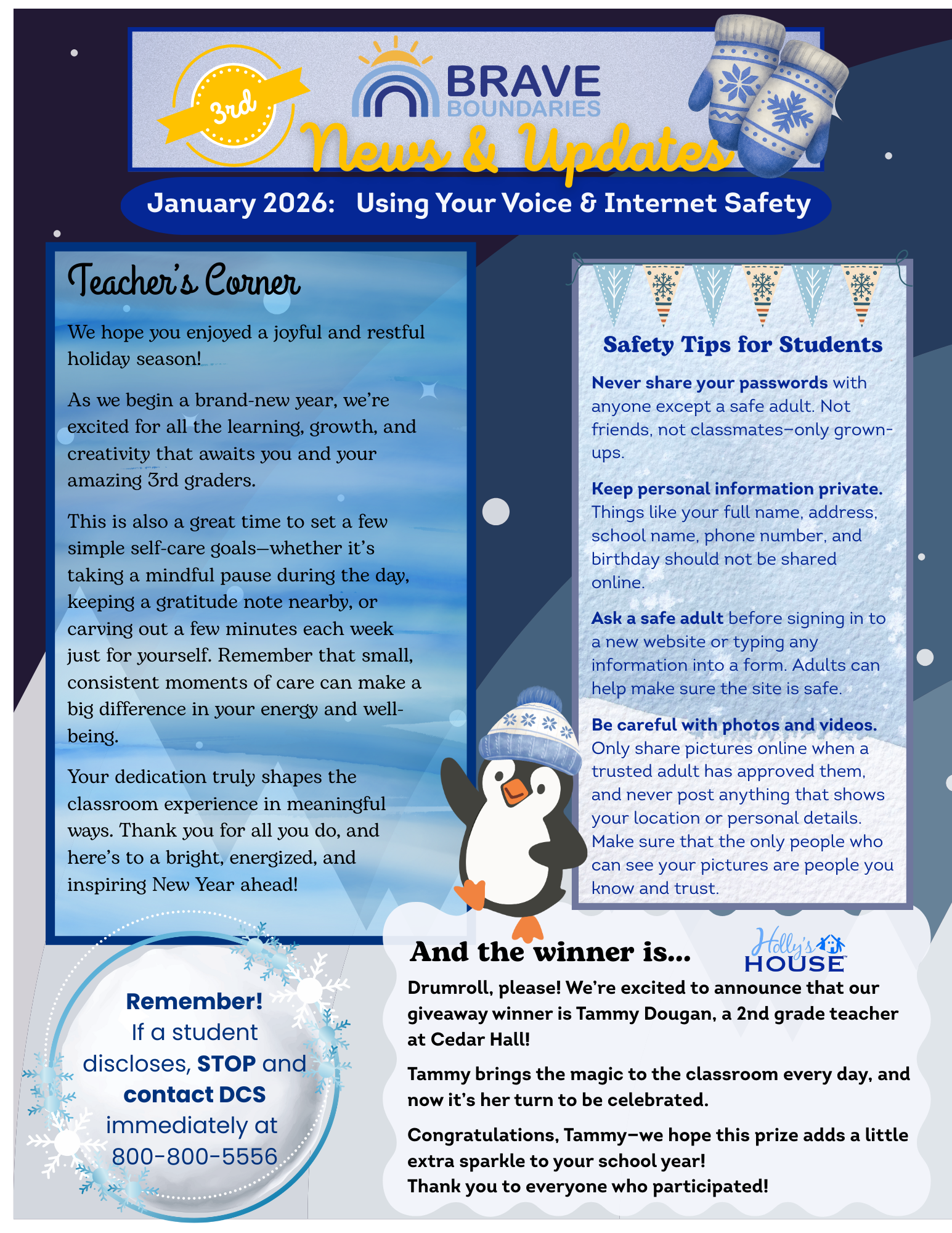 Brave Boundaries seeks to educate students on safety every day, not just once a year when we visit a student’s classroom. The Brave Boundaries newsletters allow us to reiterate the topics we cover in the classroom to students year-round. The newsletters are divided into 3 grade levels: K-2nd grades, 3rd grade, and 4th-6th grades. The newsletters are available for teachers to use in their classrooms for SEL lessons or for parents to use with their children at home. The newsletters provide safety tips, stories about Lawson the Parrot, and safety games to review material.